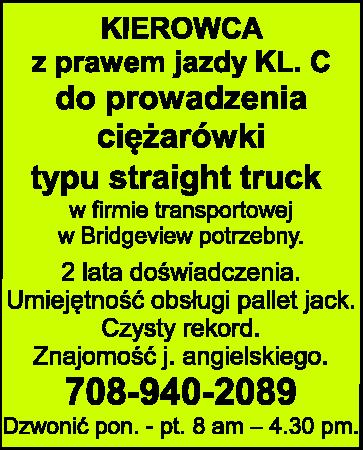 w firmie transportowej w Bridgeview potrzebny. 2 lata doświadczenia. Umiejętność obsługi pallet jack. Czysty rekord. Znajomość j. angielskiego. 708-940-2089 Dzwonić pon. - pt. 8 am – 4.30 pm.