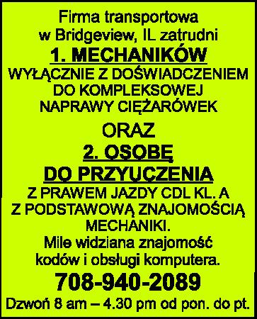 WYŁĄCZNIE Z DOŚWIADCZENIEM DO KOMPLEKSOWEJ NAPRAWY CIĘŻARÓWEK oraz OSOBĘ DO PRZYUCZENIA Z PRAWEM JAZDY CDL KL. A, Z PODSTAWOWĄ ZNAJOMOŚCIĄ MECHANIKI. Mile widziana znajomość kodów i obsługi komputera. 708-940-2089 Dzwoń 8 am - 4.30 pm od pon. do pt.