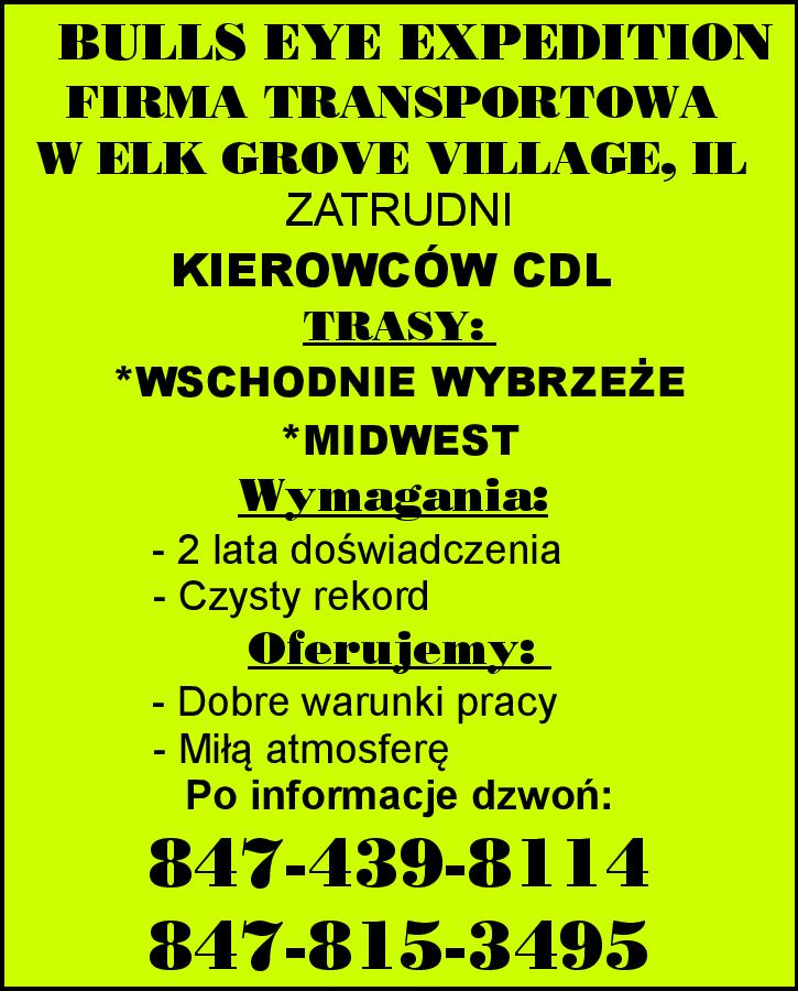 BULLS EYE EXPEDITION FIRMA TRANSPORTOWA W ELK GROVE VILLAGE, IL ZATRUDNI KIEROWCÓW CDL. TRASY: WSCHODNIE WYBRZEŻE I MIDWEST. Wymagania: - 2 lata doświadczenia - Czysty rekord Oferujemy: - Dobre warunki pracy - Miłą atmosferę Po informacje dzwoń: 847-439-8114 847-815-3495