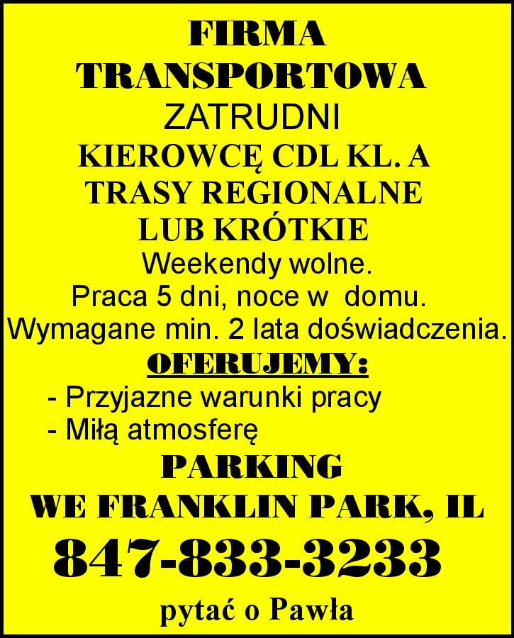 FIRMA TRANSPORTOWA ZATRUDNI KIEROWCĘ CDL KL. A. TRASY REGIONALNE LUB KRÓTKIE. Weekendy wolne. Praca 5 dni, noce w domu. Wymagane min. 2 lata doświadczenia. OFERUJEMY: - Przyjazne warunki pracy - Miłą atmosferę PARKING WE FRANKLIN PARK, IL 847-833-3233 pytać o Pawła