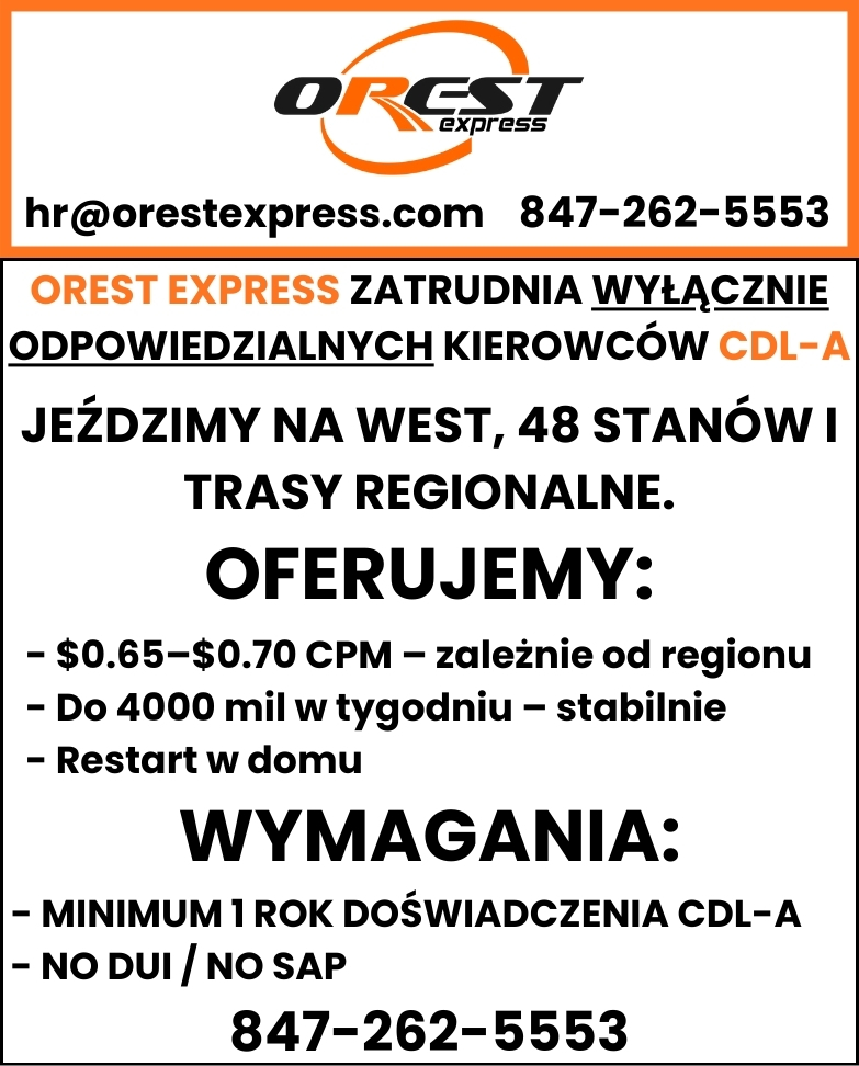OREST EXPRESS zatrudni wyłącznie odpowiedzialnych kierowców CDL kl. A. Trasy na West, 48 stanów i trasy regionalne Oferujemy: • $0.65–$0.70 CPM – zależnie od regionu • Do 4000 mil w tygodniu • Restart w domu • Praca zgodnie z logbookiem – dbamy o zdrowie i bezpieczeństwo kierowcy • Volvo […]