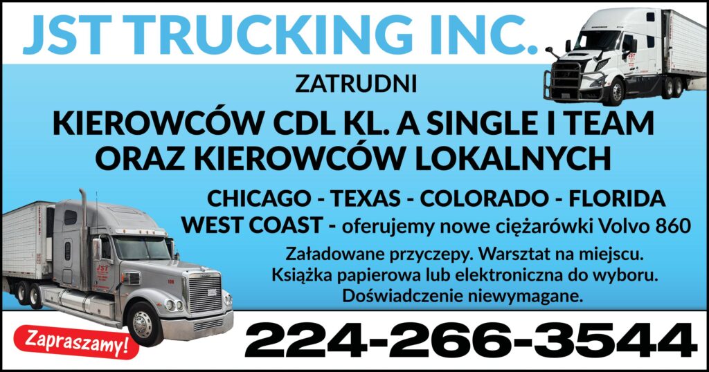 JST TRUCKING ZATRUDNI: KIEROWCÓW CDL KL. A SINGLE I TEAM ORAZ KIEROWCÓW LOKALNYCH CHICAGO - TEXAS - COLORADO - FLORIDA WEST COAST- oferujemy nowe ciężarówki Volvo 860 Załadowane przyczepy. Warsztat na miejscu. Książka papierowa lub elektroniczna do wyboru. Doświadczenie niewymagane. Z […]