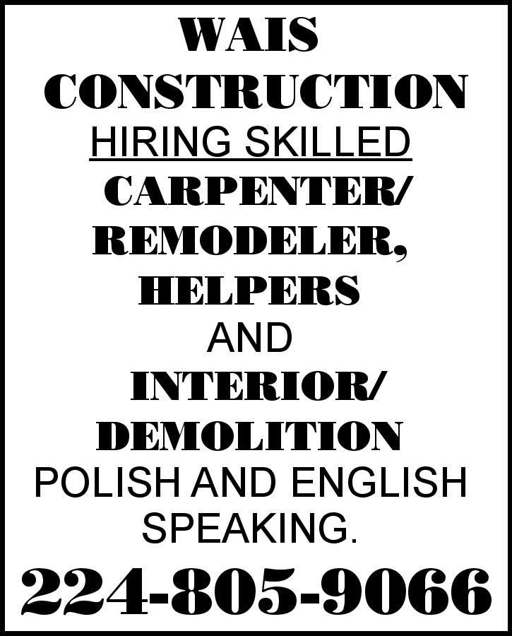 WAIS CONSTRUCTION HIRING SKILLED CARPENTER/REMODELER, HELPERS AND INTERIOR/DEMOLITION POLISH AND ENGLISH SPEAKING. 224-805-9066