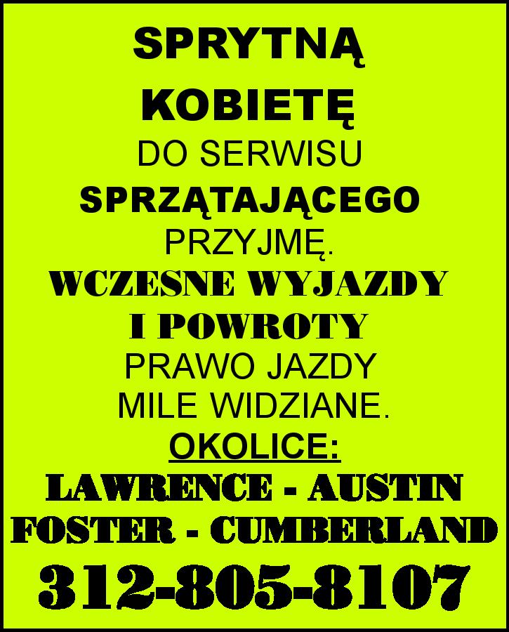 SPRYTNĄ KOBIETĘ DO SERWISU SPRZĄTAJĄCEGO PRZYJMĘ. WCZESNE WYJAZDY I POWROTY. PRAWO JAZDY MILE WIDZIANE. OKOLICE: LAWRENCE - AUSTIN, FOSTER - CUMBERLAND 312-805-8107