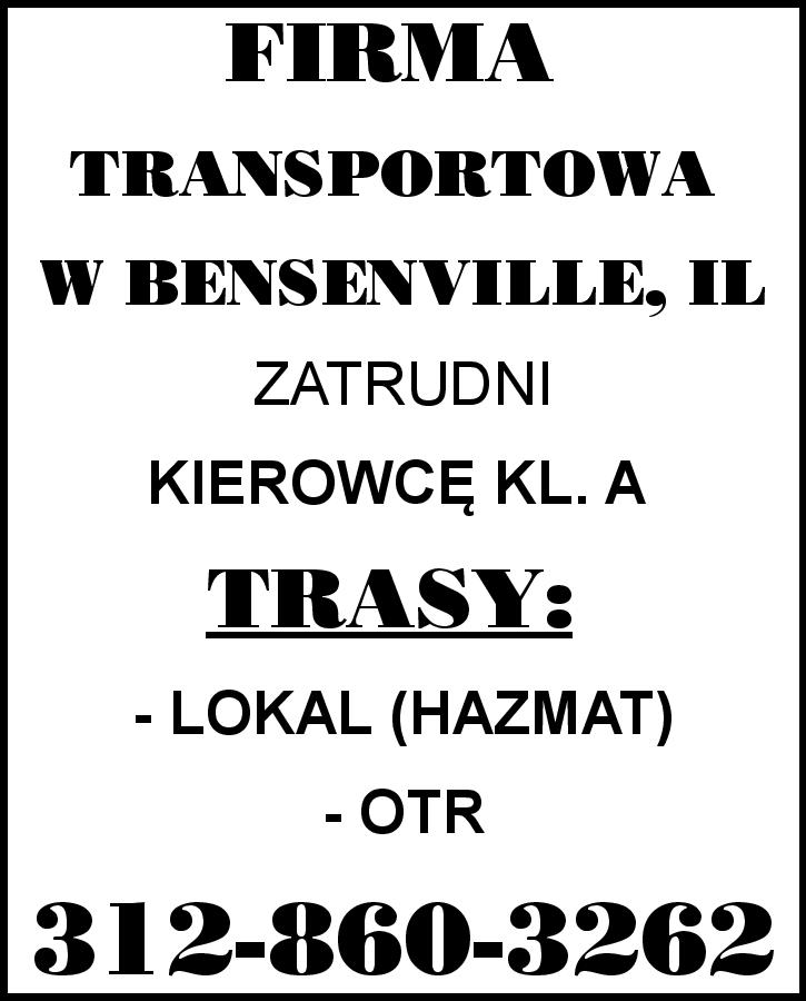 FIRMA TRANSPORTOWA W BENSENVILLE, IL ZATRUDNI KIEROWCĘ KL. A. TRASY: LOKAL (HAZMAT) I OTR 312-860-3262