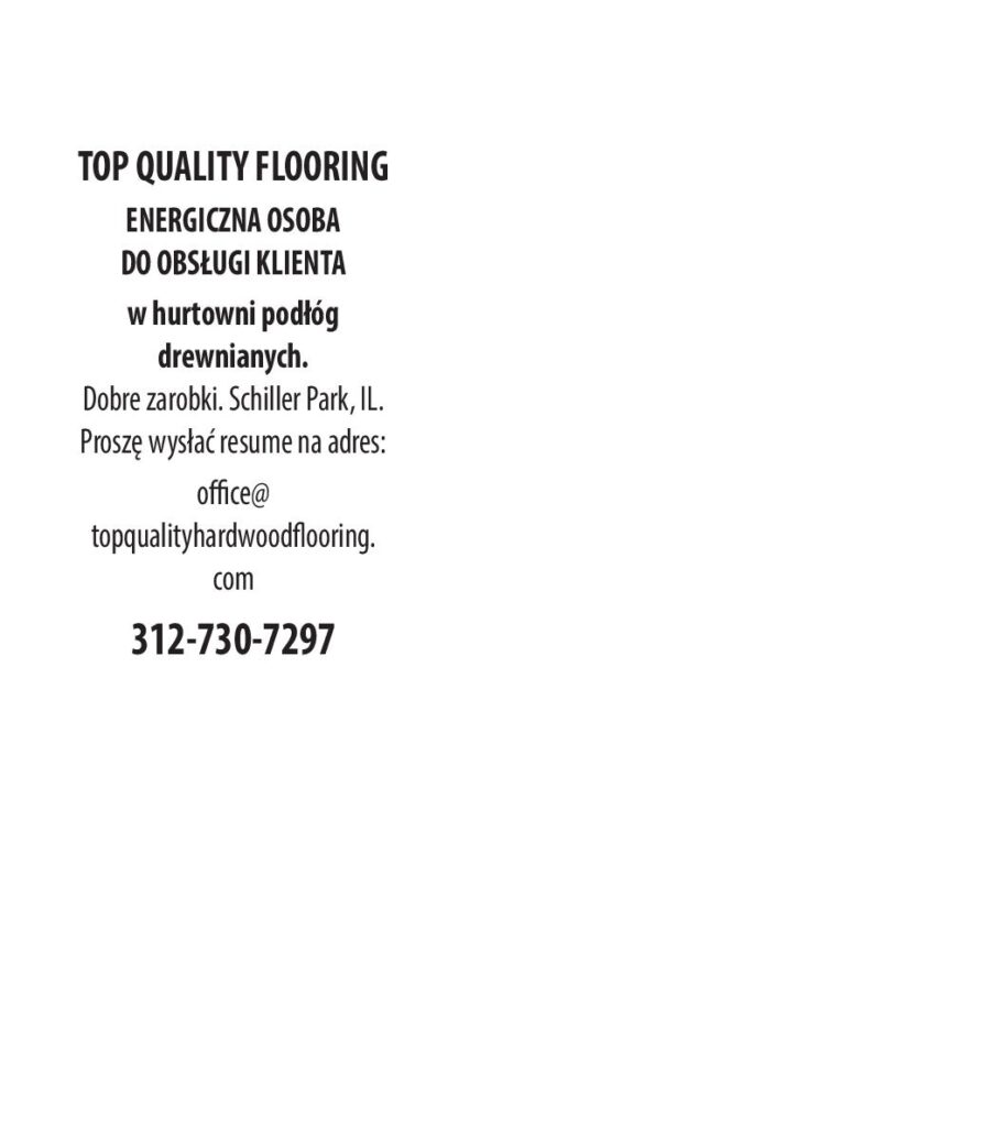 TOP QUALITY FLOORING ENERGICZNA OSOBA DO OBSŁUGI KLIENTA w hurtowni podłóg drewnianych. Dobre zarobki. Schiller Park, IL. Proszę wysłać resume […]