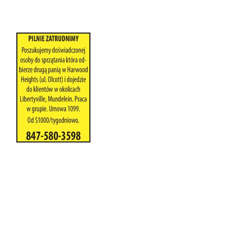 PILNIE ZATRUDNIMY Poszukujemy doświadczonej osoby do sprzątania która odbierze drugą panią w Harwood Heights (ul. Olcott) i dojedzie do klientów w okolicach Libertyville, Mundelein. Praca w grupie. Umowa 1099. Od $1000/tygodniowo. 847-580-3598