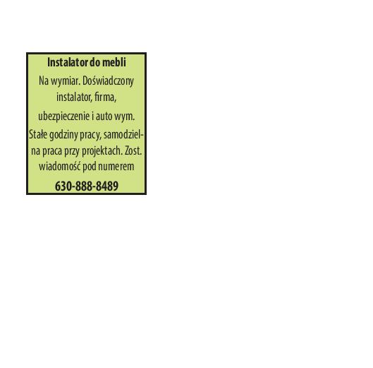 Instalator do mebli Na wymiar. Doświadczony instalator, firma, ubezpieczenie i auto wym. Stałe godziny pracy, samodzielna praca przy projektach. Zost. wiadomość pod numerem: 630-888-8489