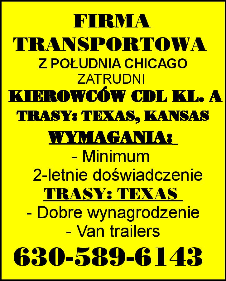 FIRMA TRANSPORTOWA Z POŁUDNIA CHICAGO ZATRUDNI KIEROWCÓW CDL KL. A. TRASY: TEXAS, KANSAS WYMAGANIA: - Minimum 2-letnie doświadczenie OFERUJEMY: - Dobre wynagrodzenie - Van trailers 630-589-6143