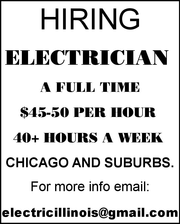 HIRING ELECTRICIAN A FULL TIME $45-50 PER HOUR. 40+ HOURS A WEEK. CHICAGO AND SUBURBS. For more info email: [email protected]