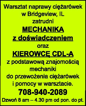 Warsztat naprawy ciężarówek w Bridgeview, IL zatrudni MECHANIKA z doświadczeniem oraz KIEROWCĘ CDL-A z podstawową znajomością mechaniki do przewożenia ciężarówek i pomocy w warsztacie. 708-940-2089 Dzwoń 8 am – 4.30 pm od pon. do pt.