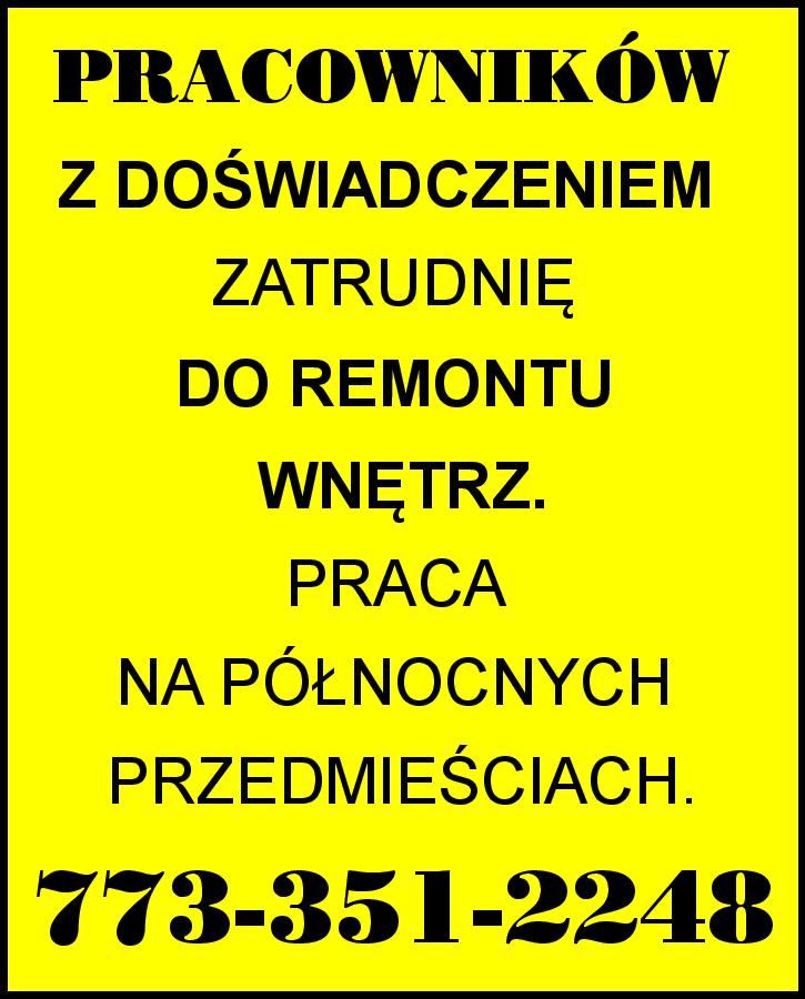 PRACOWNIKÓW Z DOŚWIADCZENIEM ZATRUDNIĘ DO REMONTU WNĘTRZ. PRACA NA PÓŁNOCNYCH PRZEDMIEŚCIACH. 773-351-2248