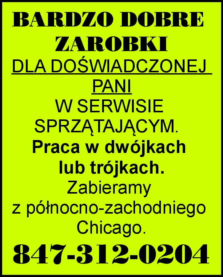 BARDZO DOBRE ZAROBKI DLA DOŚWIADCZONEJ PANI W SERWISIE SPRZĄTAJĄCYM. Praca w dwójkach lub trójkach. Zabieramy z północno-zachodniego Chicago. 847-312-0204