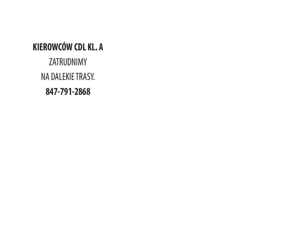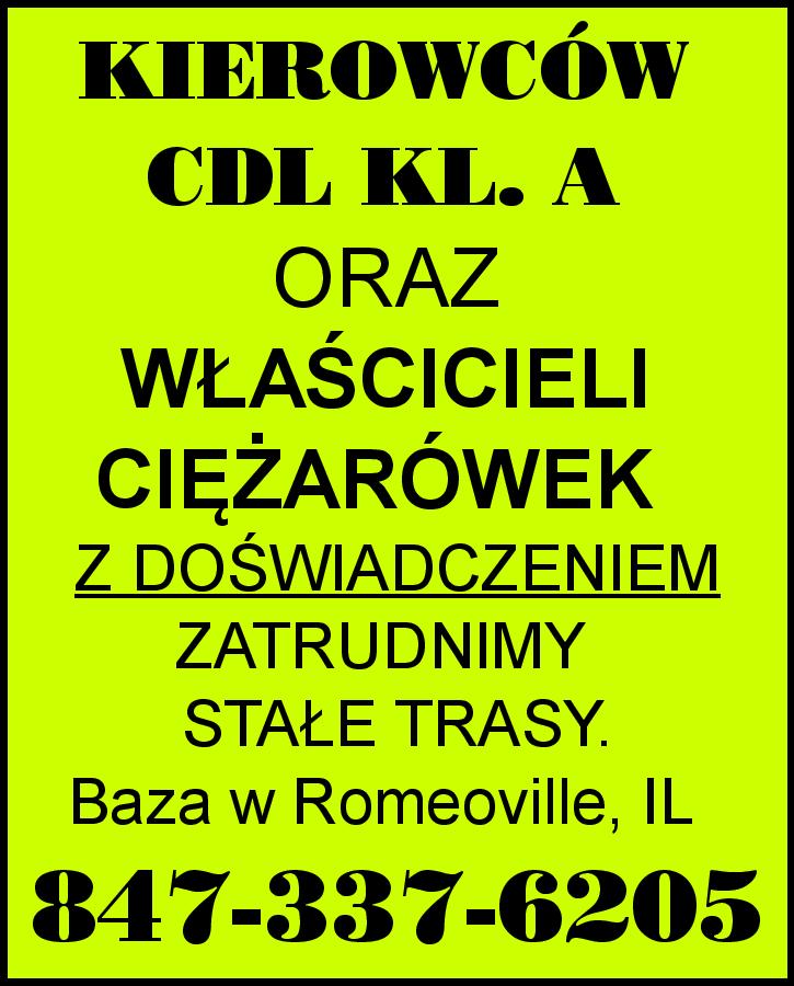FIRMA W ELGIN, IL ZATRUDNI KIEROWCĘ CDL, KL. A TRASY OTR. WYMAGANE 2 LATA DOŚWIADCZENIA I CZYSTY REKORD. Po więcej informacji proszę dzwonić: 630-828-5858