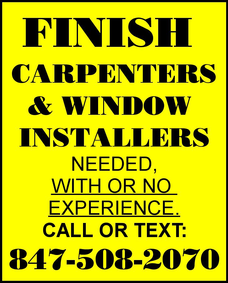 FINISH CARPENTERS & WINDOW INSTALLERS NEEDED, WITH OR NO EXPERIENCE. CALL OR TEXT: 847-508-2070
