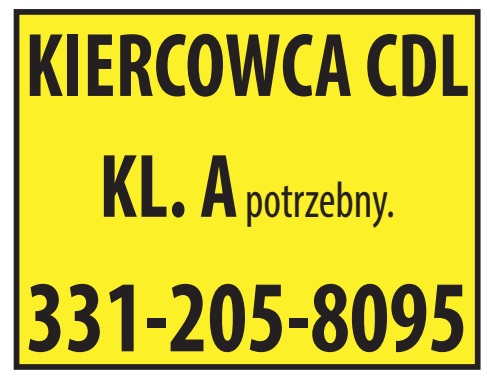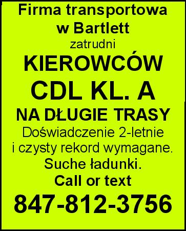 FIRMA W WEST CHICAGO, IL ZATRUDNI KIEROWCĘ CDL KL. A. Trasy: MN, MI, TX Doświadczenie wymagane. Stała praca, weekendy w domu. Możliwość pracy bez ELD. 847-848-1357 773-691-4107