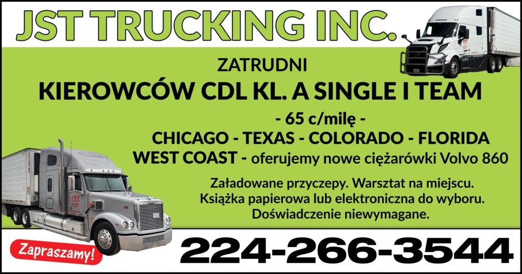 JST TRUCKING ZATRUDNI: KIEROWCÓW CDL KL. A SINGLE I TEAM - 65c/milę - CHICAGO - TEXAS - COLORADO. WEST COAST- oferujemy nowe ciężarówki. Volvo 860. Załadowane przyczepy. Warsztat na miejscu. Książka papierowa lub elektroniczna do wyboru. Doświadczenie niewymagane. ZAPRASZAMY! 224-266-3544
