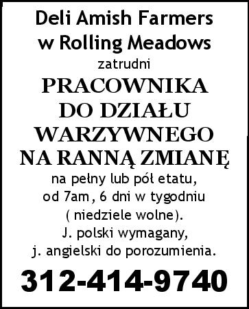 Deli Amish Farmers ROLLING MEADOWS zatrudni: PRACOWNIKA DO DZIAŁU WARZYWNEGO NA RANNĄ ZMIANĘ na pełny lub pół etatu, od 7am, 6 dni w tygodniu ( niedziele wolne). J. polski wymagany, j. angielski do porozumienia. 312-414-9740