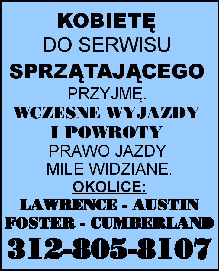KOBIETĘ DO SERWISU SPRZĄTAJĄCEGO PRZYJMĘ. WCZESNE WYJAZDY I POWROTY. PRAWO JAZDY MILE WIDZIANE. OKOLICE: LAWRENCE - AUSTIN FOSTER - CUMBERLAND 312-805-8107