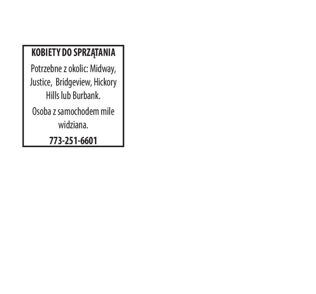 KOBIETY DO SPRZĄTANIA Potrzebne z okolic: Midway, Justice, Bridgeview, Hickory Hills lub Burbank. Osoba z samochodem mile widziana. 773-251-6601