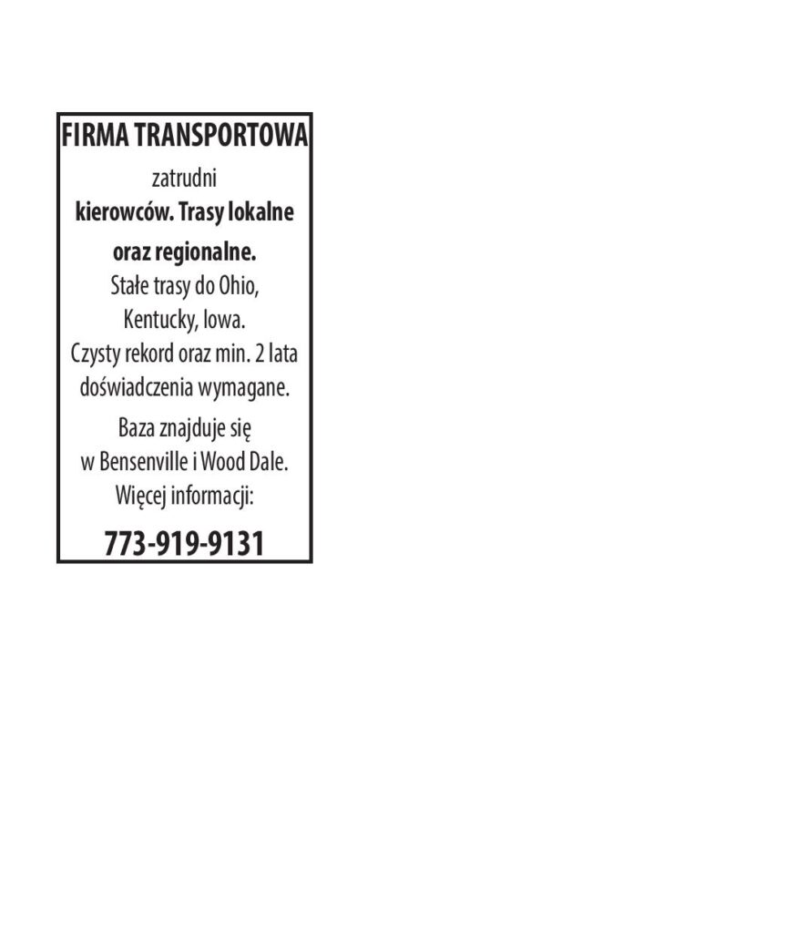 KIEROWCÓW CDL KL. A zatrudnię do pracy lokalnej Minimum 2 lata doświadczenia. Elastyczne godziny pracy. Atrakcyjne zarobki. Baza w Chicago, IL 60638 331-308-0708