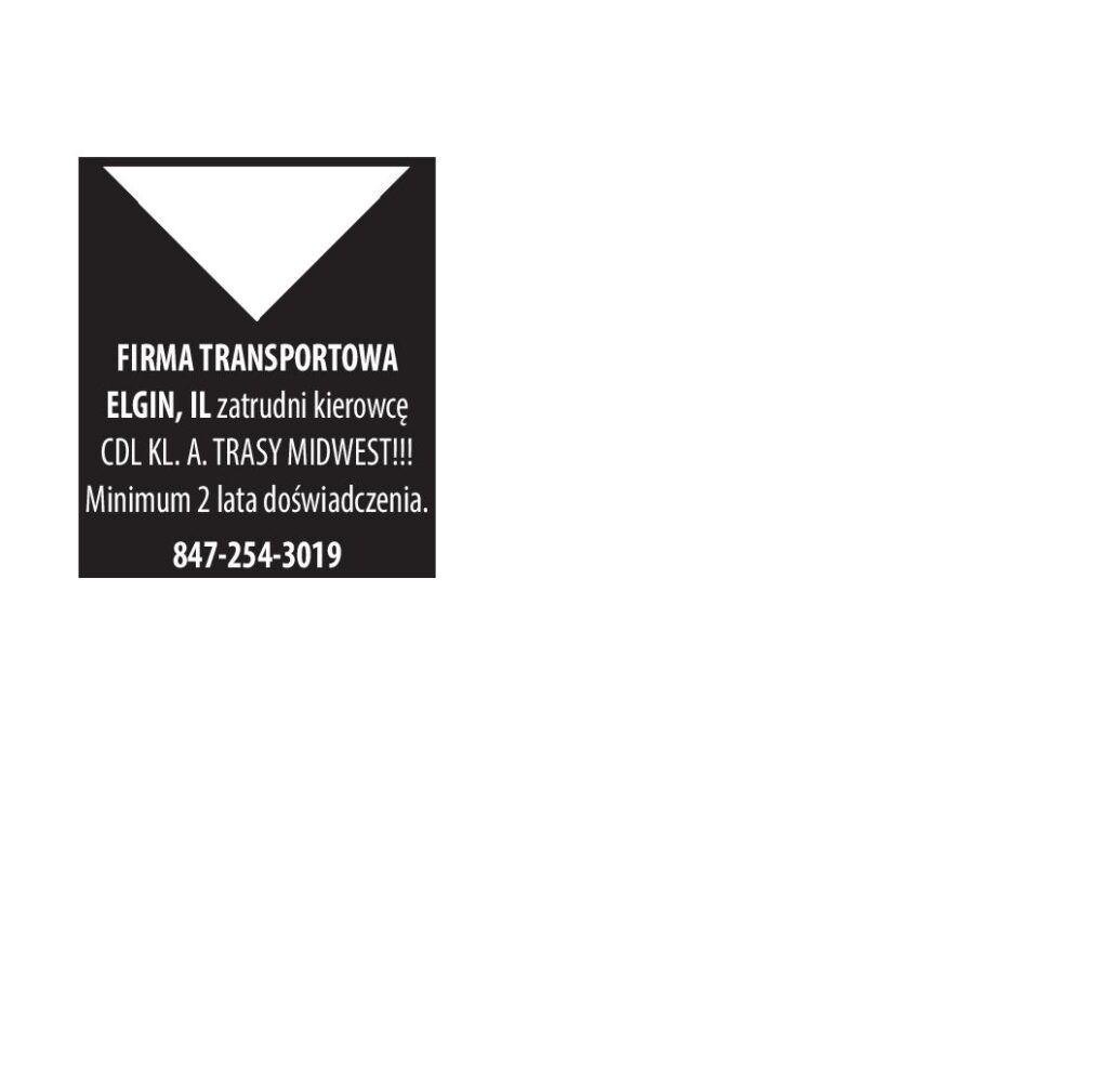 FIRMA TRANSPORTOWA ELGIN, IL zatrudni kierowcę CDL KL. A. TRASY MIDWEST!!! Minimum 2 lata doświadczenia. 847-254-3019