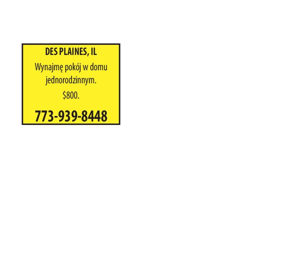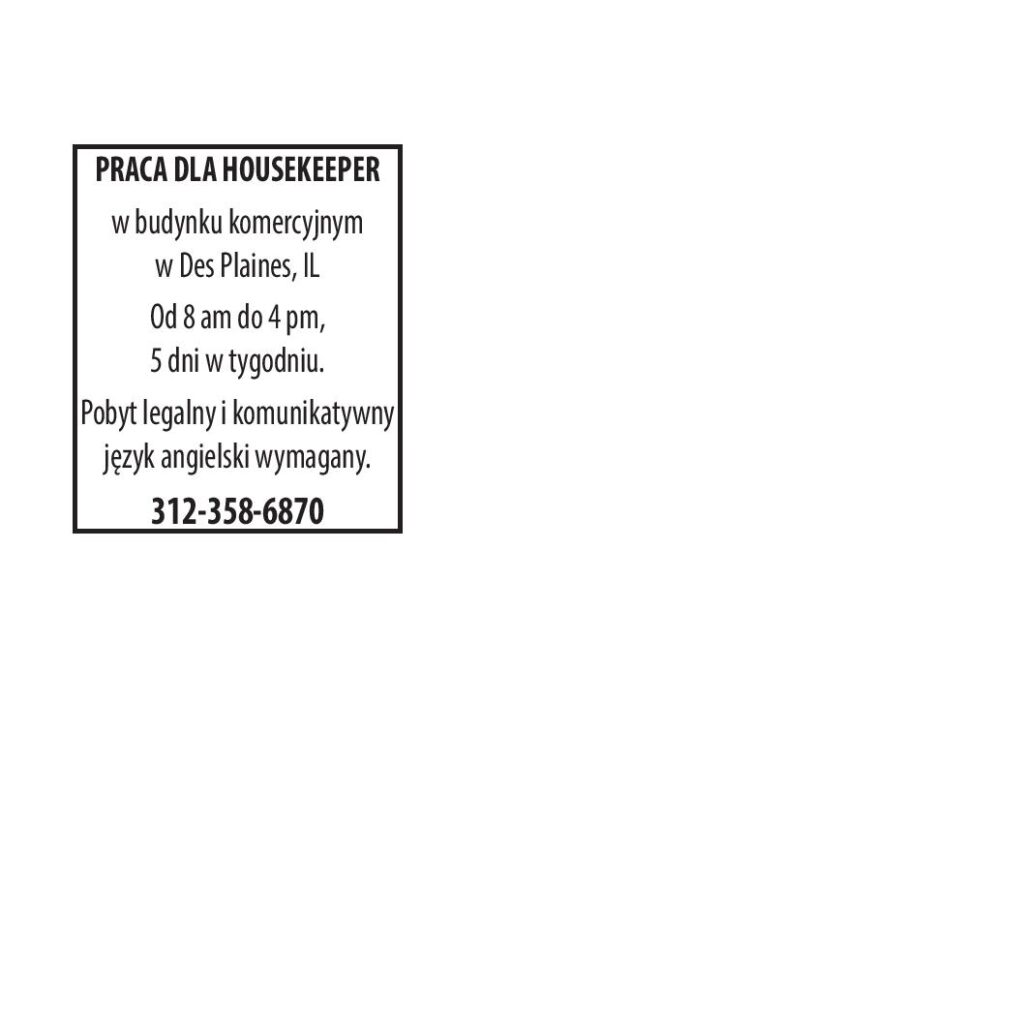 PRACA DLA HOUSEKEEPER w budynku komercyjnym w Des Plaines, IL Od 8 am do 4 pm, 5 dni w tygodniu. Pobyt legalny i komunikatywny język angielski wymagany. 312-358-6870