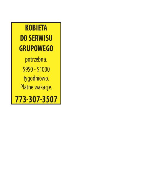 KOBIETA DO SERWISU GRUPOWEGO potrzebna. $950 - $1000 tygodniowo. Płatne wakacje. 773-307-3507
