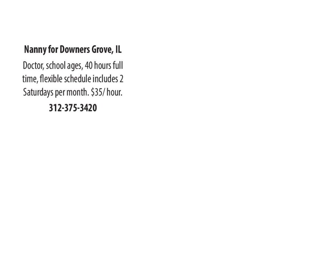 Nanny for Downers Grove, IL Doctor, school ages, 40 hours full time, flexible schedule includes 2 Saturdays per month. $35/ hour. 312-375-3420