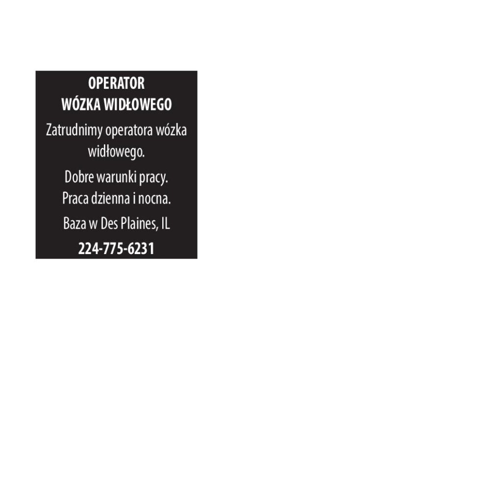 OPERATOR WÓZKA WIDŁOWEGO Zatrudnimy operatora wózka widłowego. Dobre warunki pracy. Praca dzienna i nocna. Baza w Des Plaines, IL 224-775-6231