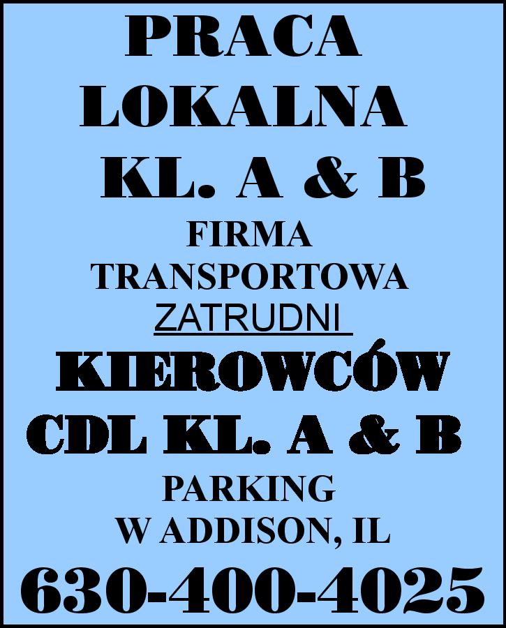 PRACA LOKALNA - KL. A & B FIRMA TRANSPORTOWA ZATRUDNI KIEROWCÓW CDL KL. A & B PARKING W ADDISON, IL 630-400-4025