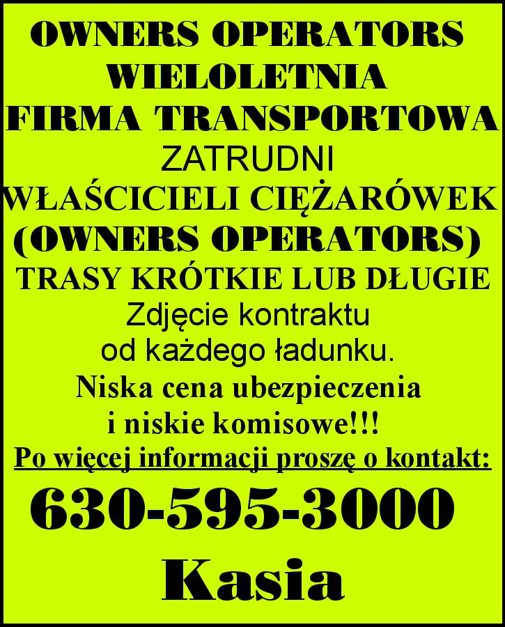 OWNERS OPERATORS WIELOLETNIA FIRMA TRANSPORTOWA ZATRUDNI WŁAŚCICIELI CIĘŻARÓWEK (OWNERS OPERATORS). TRASY KRÓTKIE LUB DŁUGIE. Zdjęcie kontraktu od każdego ładunku. Niska cena ubezpieczenia i niskie komisowe!!! Po więcej informacji proszę o kontakt: 630-595-3000, Kasia