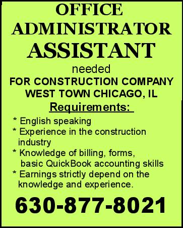 needed FOR CONSTRUCTION COMPANY WEST TOWN CHICAGO, IL REQUIREMENTS: - English speaking - Experience in the construction industry - Knowledge of billing, forms Basic QuickBook accounting skills - Earnings strictly depend on the knowledge and experience. 630-877-8021