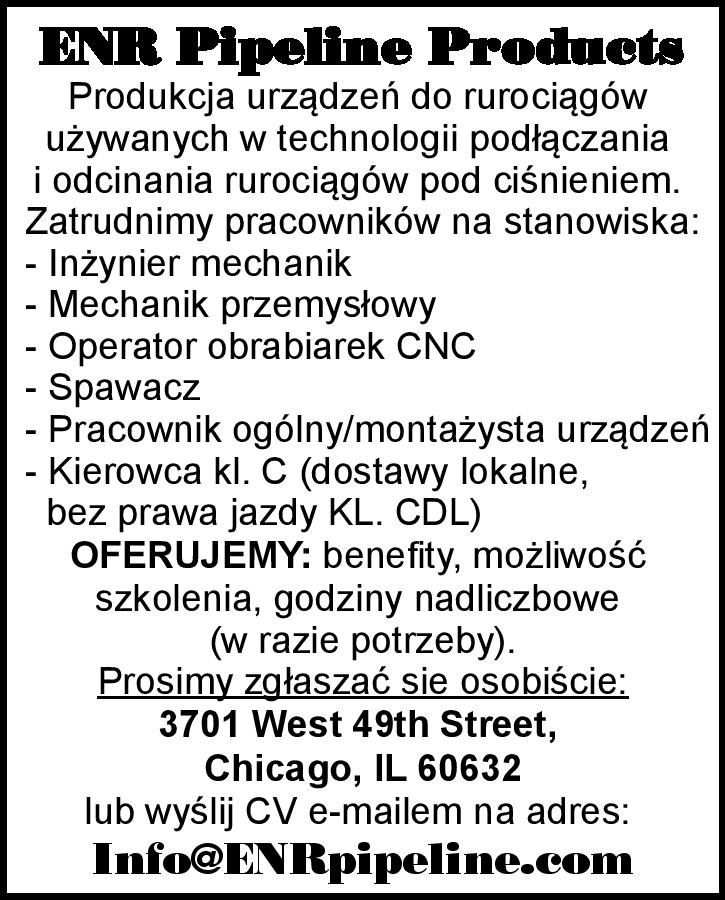 ENR Pipeline Products Produkcja urządzeń do rurociągów używanych w technologii podłączania i odcinania rurociągów pod ciśnieniem. Zatrudnimy pracowników na stanowiska: - Inżynier mechanik - Mechanik przemysłowy - Operator obrabiarek CNC - Spawacz - Pracownik ogólny/montażysta urządzeń - […]