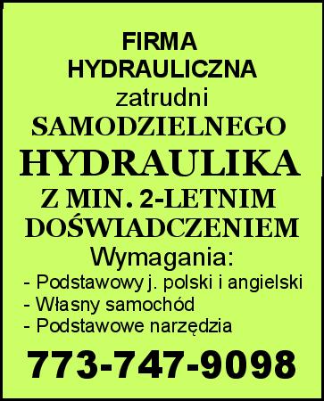 FIRMA HYDRAULICZNA zatrudni SAMODZIELNEGO HYDRAULIKA Z MIN. 2 LETNIM DOŚWIADCZENIEM. Wymagania: - Podstawowy j. polski i angielski - Własny samochód - Podstawowe narzędzia 773-747-9098