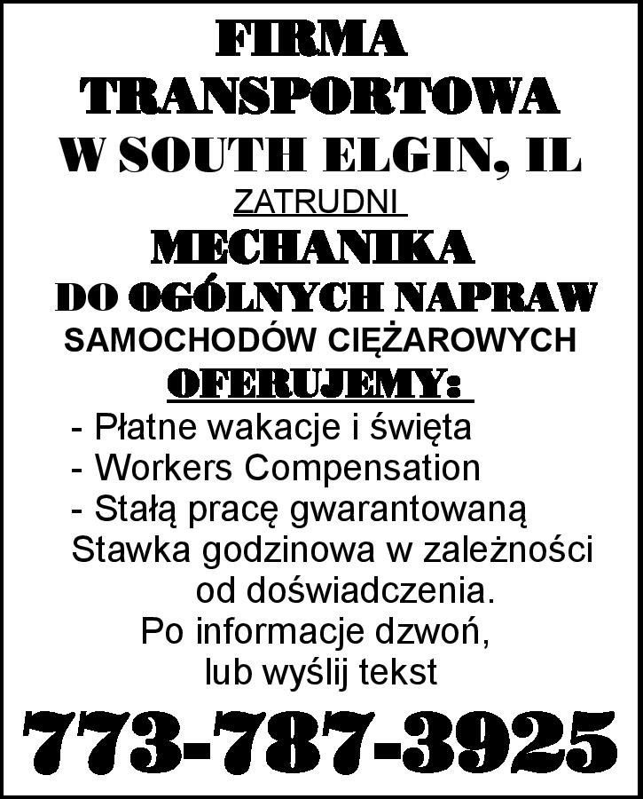 FIRMA TRANSPORTOWA W SOUTH ELGIN, IL ZATRUDNI MECHANIKA DO OGÓLNYCH NAPRAW SAMOCHODÓW CIĘŻAROWYCH. OFERUJEMY: - Płatne wakacje i święta - Workers Compensation - Stałą pracę gwarantowaną Stawka godzinowa w zależności od doświadczenia. Po informacje dzwoń lub wyślij tekst: 773-787-3925
