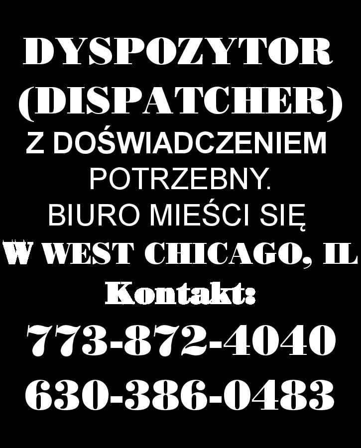 DYSPOZYTOR (DISPATCHER) Z DOŚWIADCZENIEM POTRZEBNY. BIURO MIEŚCI SIĘ W WEST CHICAGO, IL Kontakt: 773-872-4040 630-386-0483
