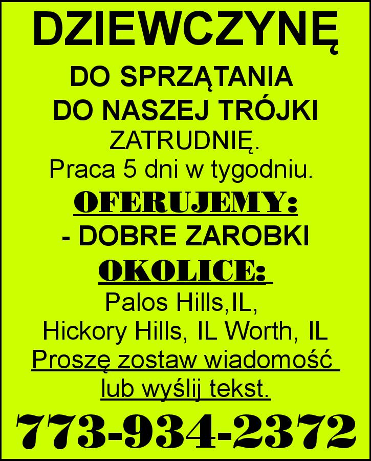 DZIEWCZYNĘ DO SPRZĄTANIA DO NASZEJ TRÓJKI ZATRUDNIĘ. Praca 5 dni w tygodniu. OFERUJEMY: - DOBRE ZAROBKI OKOLICE: Palos Hills, IL, Hickory Hills, IL, Worth, IL Proszę zostaw wiadomość lub wyślij tekst. 773-934-2372