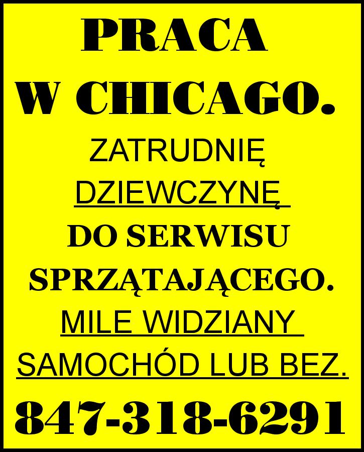 PRACA W CHICAGO. ZATRUDNIĘ DZIEWCZYNĘ DO SERWISU SPRZĄTAJĄCEGO. MILE WIDZIANY SAMOCHÓD LUB BEZ. 847-318-6291