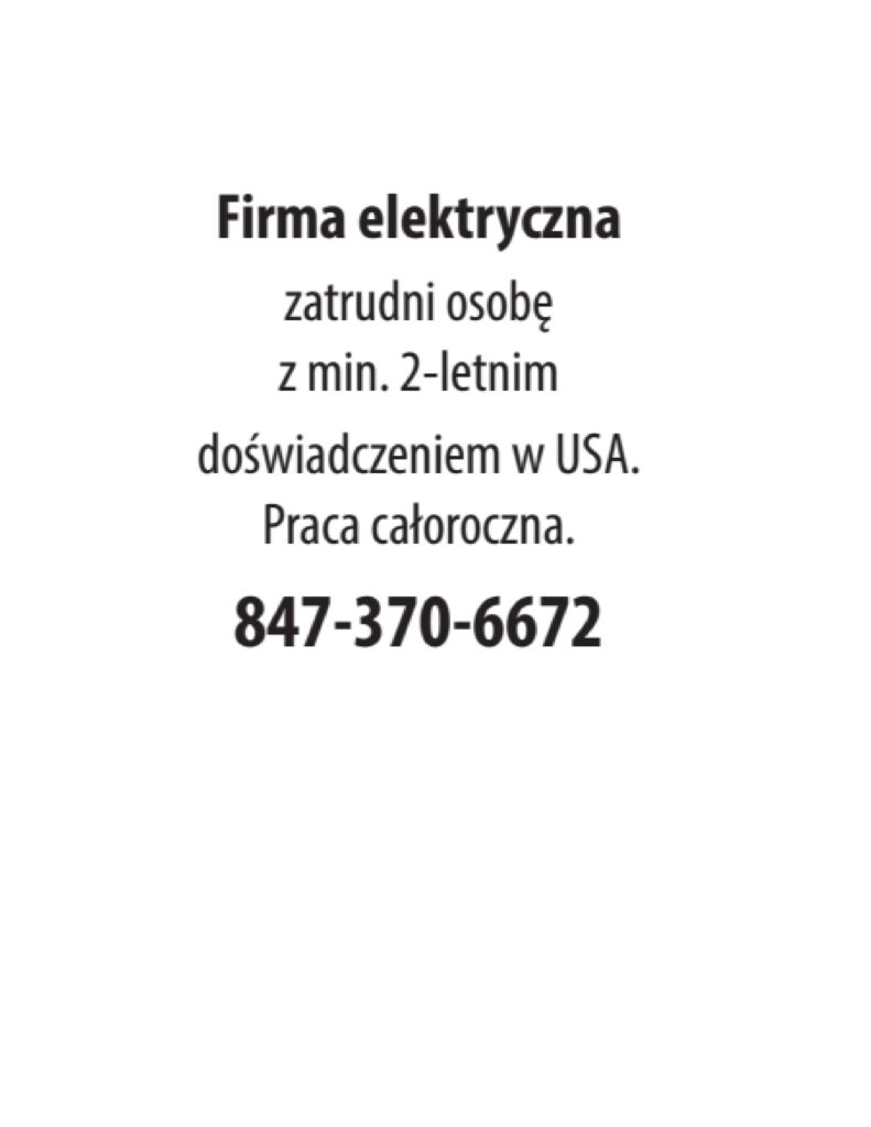 z min. 2-letnim doświadczeniem w USA. Praca całoroczna. 847-370-6672
