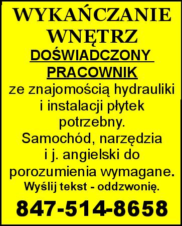 DOŚWIADCZONY PRACOWNIK ze znajomością hydrauliki i instalacji płytek potrzebny. Samochód, narzędzia i j. angielski do porozumienia wymagane. Wyślij text - oddzwonię. 847-514-8658