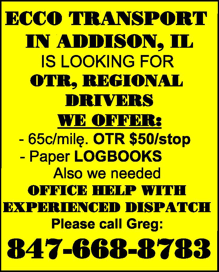 ECCO TRANSPORT IN ADDISON, IL IS LOOKING FOR OTR, REGIONAL DRIVERS WE OFFER: - 65c/milę. OTR $50/stop - Paper LOGBOOKS Also we needed OFFICE HELP WITH EXPERIENCED DISPATCH Please call Greg: 847-668-8783