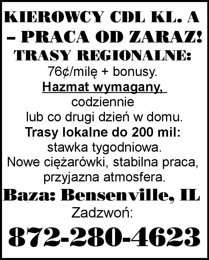 zatrudni KIEROWCÓW CDL - A Lokalna, Regionalna do $32/godz. Hazmat preffered. Praca od poniedziałku do piątku. Oferujemy: > Płatne wakacje, > Załadowane naczepy, Warsztat na miejscu, > 1099 - direct deposit. Prosimy dzwonić: 773-567-0326