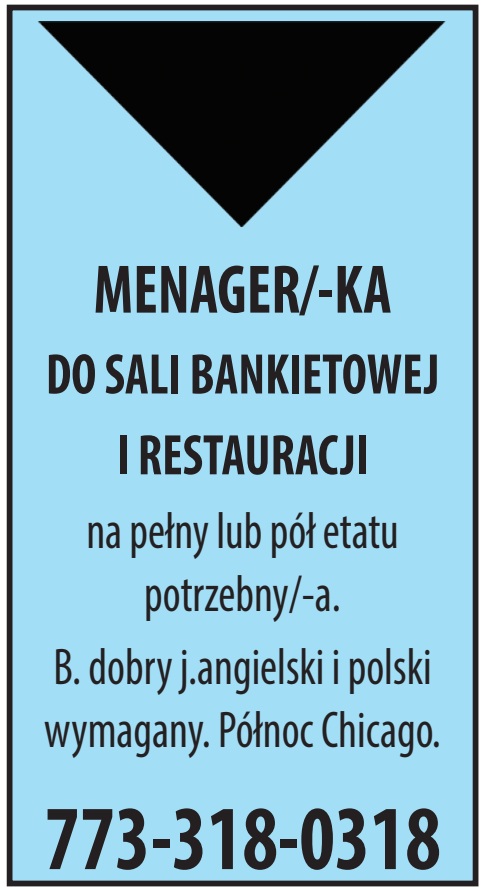 SPRZEDAWCA (SALES REPRESENTATIVE) do hurtowni chemicznej w Elk Grove Village potrzebny. J. angielski i polski wymagany. Doświadczenie mile widziane - przyuczymy. Tatiana 847-262-0065 MANAGER DO FIRMY SPRZĄTAJĄCEJ Pół etatu na popołudniową zmianę potrzebny. 847-305-3777