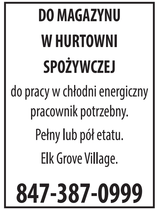 do pracy w chłodni energiczny pracownik potrzebny. Pełny lub pół etatu. Elk Grove Village. 847-387-0999