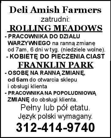 Deli Amish Farmers ROLLING MEADOWS zatrudni: - PRACOWNIKA DO DZIAŁU WARZYWNEGO na ranną zmianę, od 7am, 6 dni w tygodniu ( niedziele wolne) - KOBIETE DO PIECZENIA CIAST FRANKLIN PARK - OSOBĘ NA RANNĄ ZMIANĘ, od 6am do otwarcia sklepu i obsługi klienta - PRACOWNIKA NA POŁUDNIOWA ZMIANĘ do […]