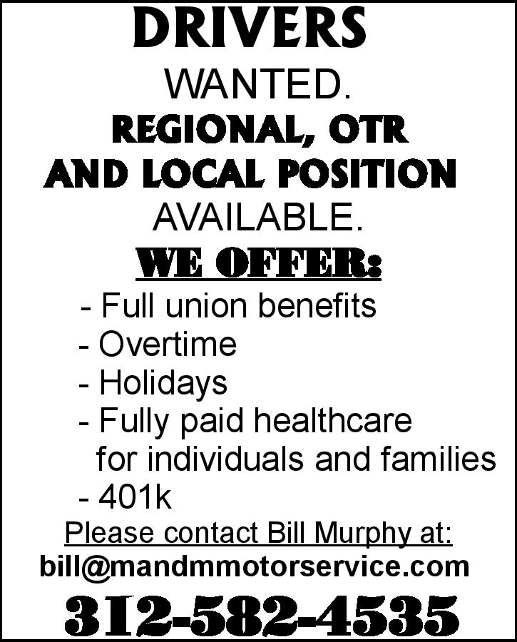 DRIVERS WANTED. REGIONAL OTR AND LOCAL POSITION AVAILABLE. WE OFFER: - Full union benefits - Overtime - Holidays - Fully paid healthcare for individuals and families - 401k Please contact Bill Murphy at [email protected] 312-582-4535