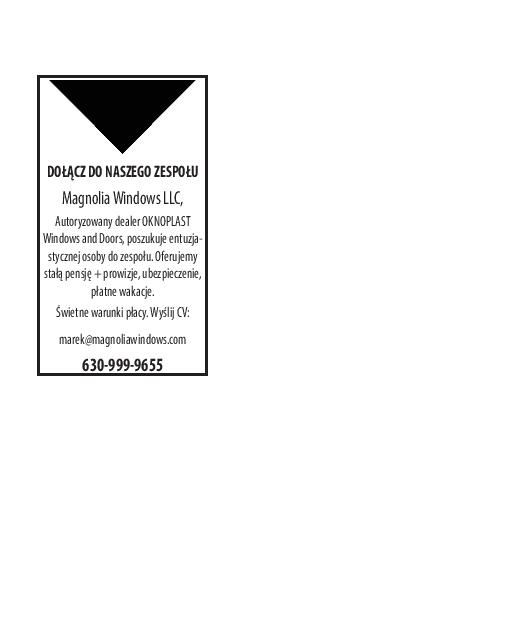 DOŁĄCZ DO NASZEGO ZESPOŁU Magnolia Windows LLC, Autoryzowany dealer OKNOPLAST Windows and Doors, poszukuje entuzjastycznej osoby do zespołu. Oferujemy stałą pensję + prowizje, ubezpieczenie, płatne wakacje. Świetne warunki płacy. Wyślij CV: [email protected] 630-999-9655