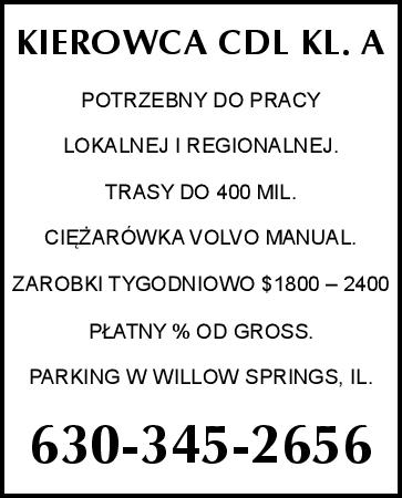 KIEROWCA CDL KL. A POTRZEBNY DO PRACY LOKALNEJ I REGIONALNEJ. TRASY DO 400 MIL. CIĘŻARÓWKA VOLVO MANUAL. ZAROBKI TYGODNIOWO $1800 - 2400 PŁATNY % OD GROSS. PARKING W WILLOW SPRINGS, IL. 630-345-2656