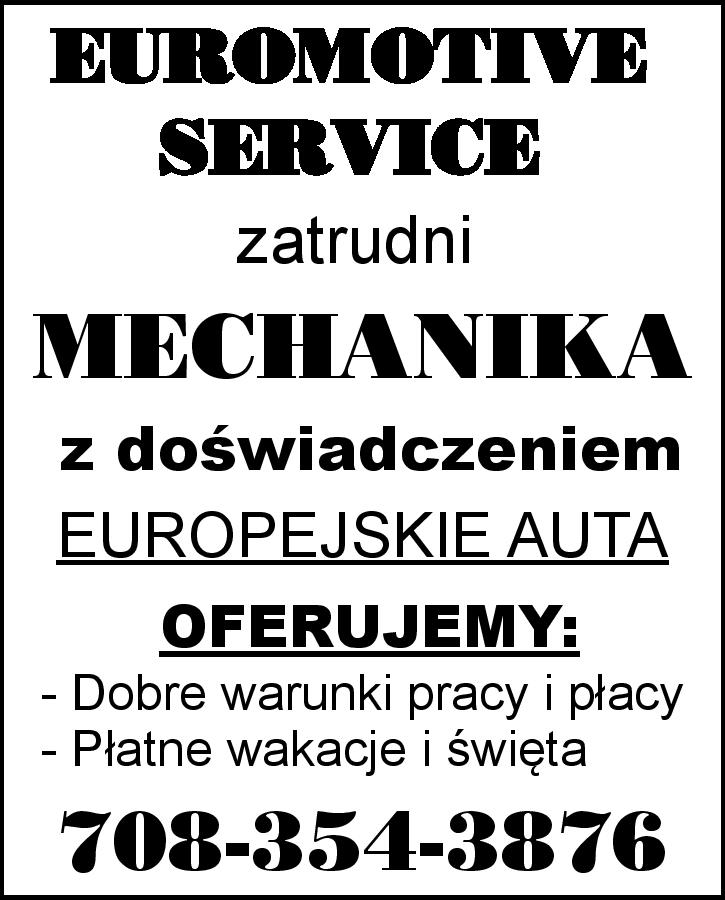 EUROMOTIVE SERVICE ZATRUDNI MECHANIKA z doświadczeniem. Europejskie auta. OFERUJEMY: - Dobre warunki pracy i płacy - Płatne wakacje i święta 708-354-3876